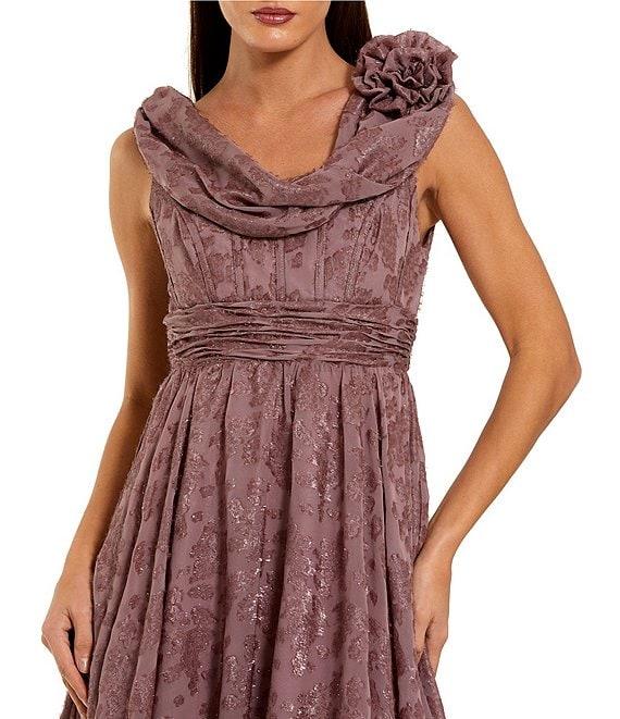From Mac Duggal, this dress features: Burnout chiffon fabrication A line silhouette Cowl neckline Sleeveless Burnout print Zip back closure Approx. 45" length Polyester Hand wash cold Imported.