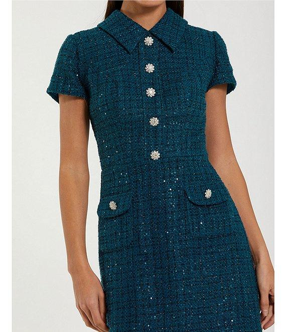 Mac Duggal Cap Sleeve Collared Boucle Button Up Dress
