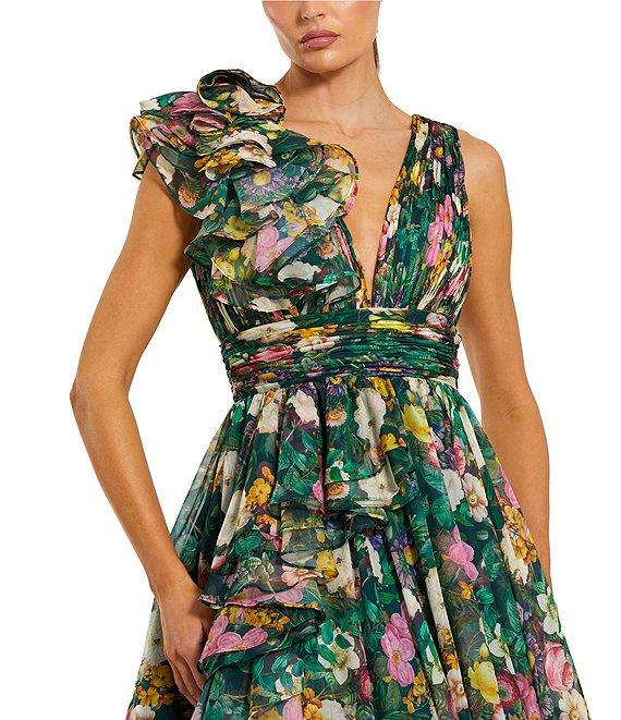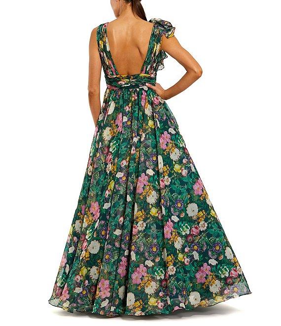 Mac Duggal Chiffon Floral Print V Neck Sleeveless Ruffle A-Line Gown