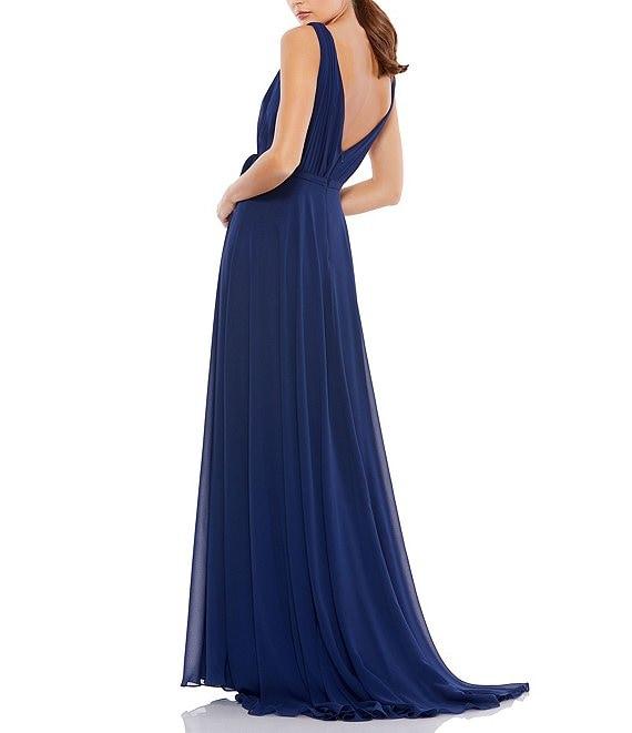 From Mac Duggal, this gown features: Chiffon fabrication Trapeze silhouette Plunge neckline Sleeveless Draped tie Thigh high slit Pleated detail Fully lined Flutter hemline Center back zip closure Approx. 60" length Polyester Hand wash Imported.