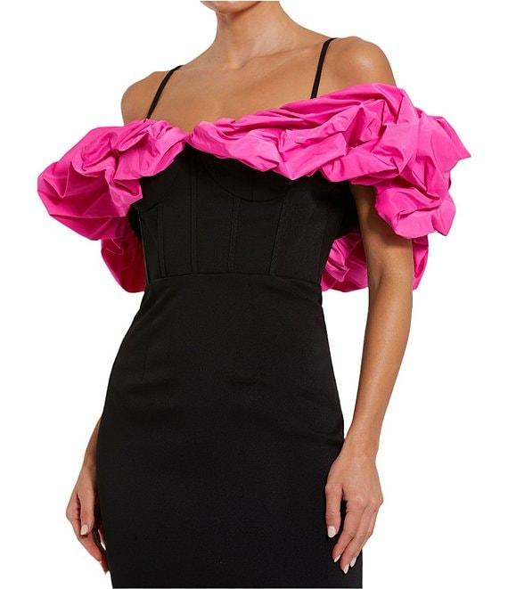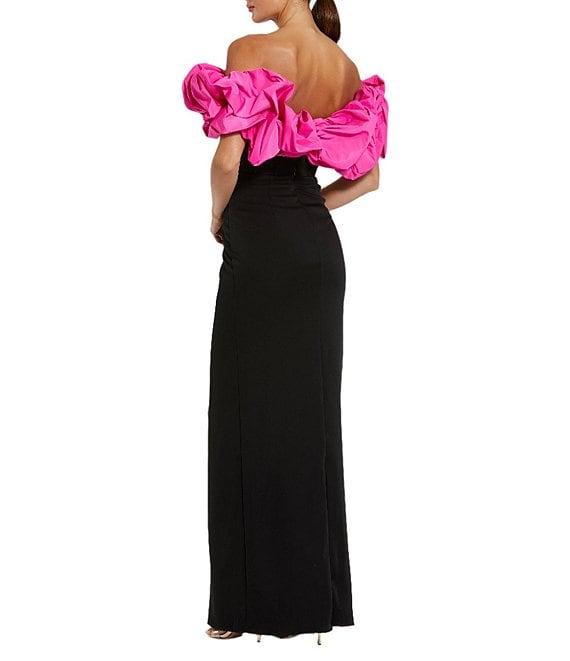 From Mac Duggal, this dress features: Crepe/faille fabrication Color block Ball gown silhouette Off-the-shoulder neckline Ruffle sleeve detail Fully lined Back zipper closure Approx. 59" length Polyester Hand wash Imported.
