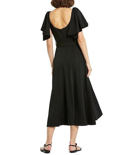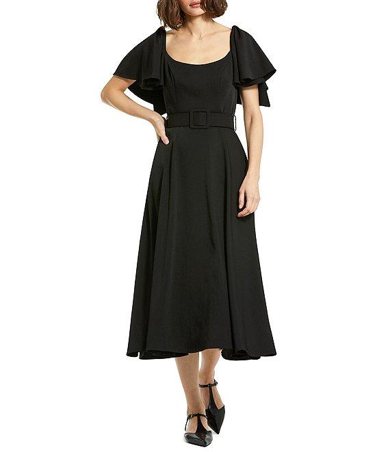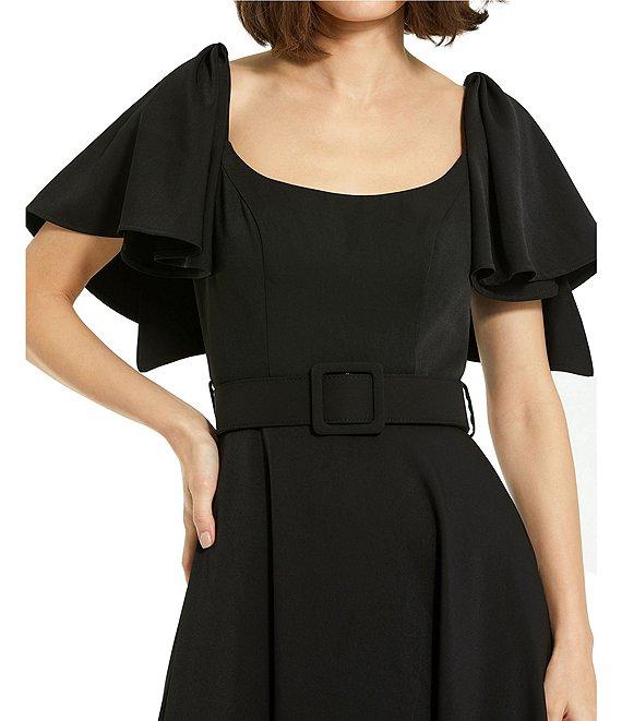 From Mac Duggal, this dress features: Crepe fabrication A-line silhouette Scoop neckline Short ruffle sleeves Self-fabric covered belt Midi length Fully lined Straight hemline Concealed back zipper closure Approx. 49.5" length Polyester Hand wash Imported.