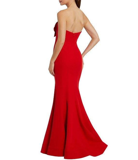 From Mac Duggal, this gown features: Crepe fabrication Mermaid silhouette Strapless neckline Sleeveless 3D flower pattern Fully lined Flutter hemline Concealed back zip closure Approx. 60" length Polyester/spandex Hand wash Imported.