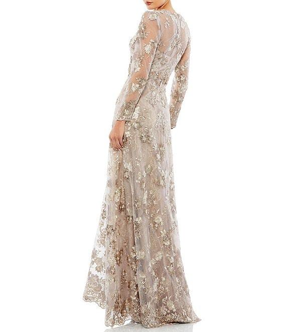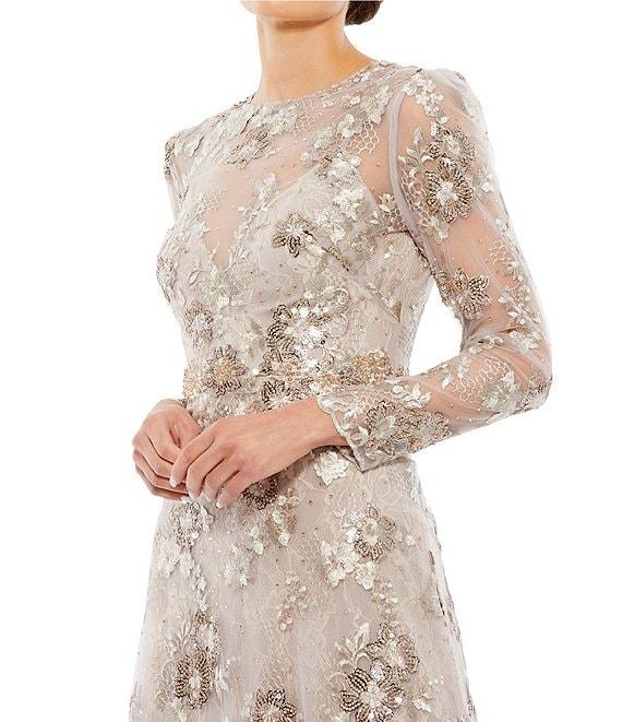 From Mac Duggal, this dress features: Embroidered fabrication Sheath silhouette Illusion crew neckline Illusion long sleeves Embellished sequin Fully lined Zip back closure Approx. 60" length Polyester Dry clean Imported.