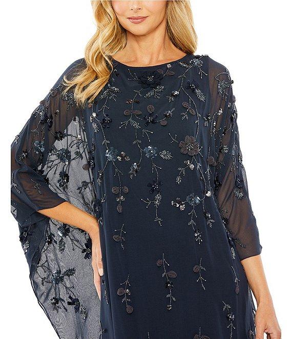 From Mac Duggal, this dress features: Embellished mesh fabrication Caftan gown silhouette Boat neckline Long sleeve 3D flower detail Fully lined Back zipper closure Approx. 59" length Polyester Hand wash Imported.