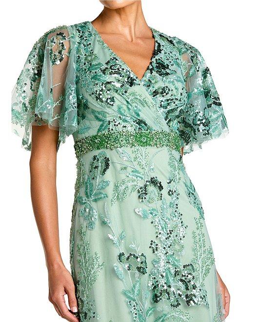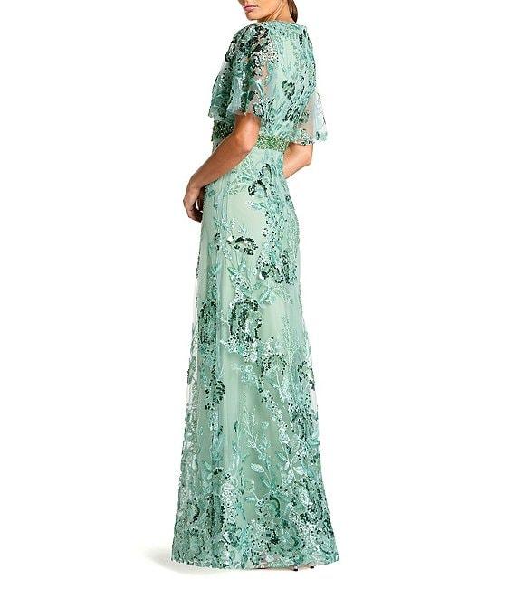 From Mac Duggal, this dress features: Embellished mesh fabrication Floral print V-neckline Short sleeves Lined Back zipper closure Approx. 60" length Polyester Hand wash Imported.