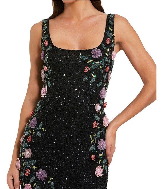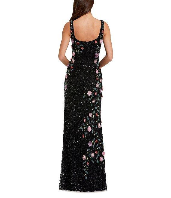 From Mac Duggal, this dress features: Embellished mesh fabrication Gown silhouette Square neckline Sleeveless 3D flower detail Fully lined Back zipper closure Approx. 59" length Polyester Hand wash Imported.