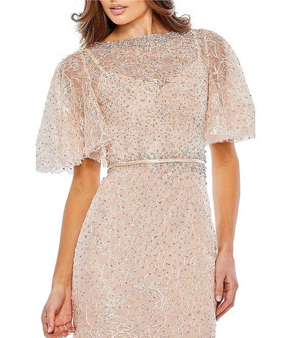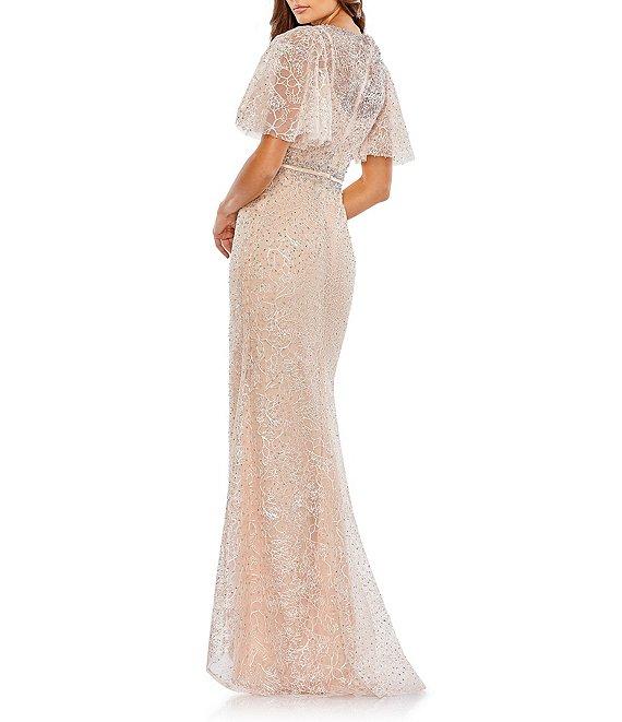 From Mac Duggal, this dress features: Embroidered fabrication Trumpet gown silhouette Illusion crew neckline Illusion short flutter sleeves Fully lined Zip back closure Approx. 60" length Polyester Dry clean Imported.