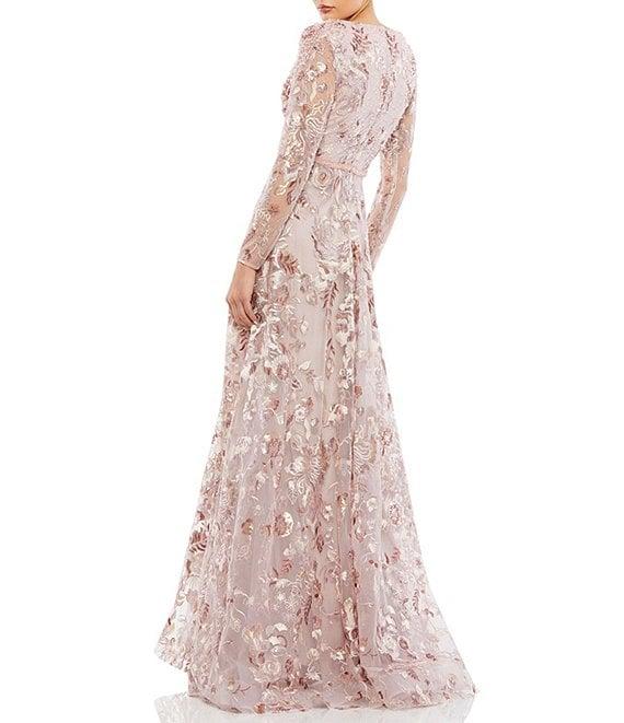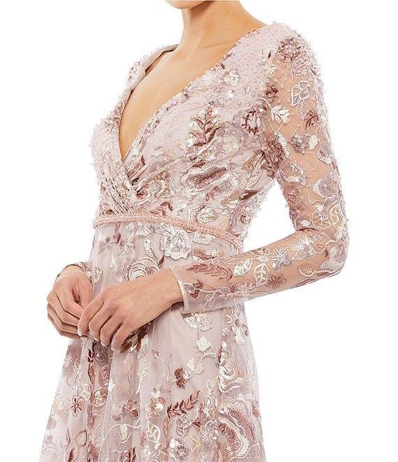 From Mac Duggal, this dress features: Embroidered fabrication A-line silhouette V-neckline Long sleeves Illusion long sleeves Zip back closure Approx. 60" length Polyester Hand wash cold Imported.