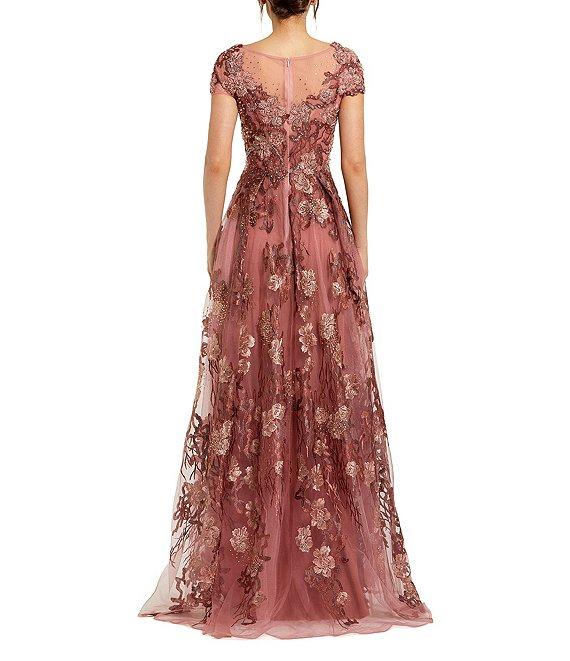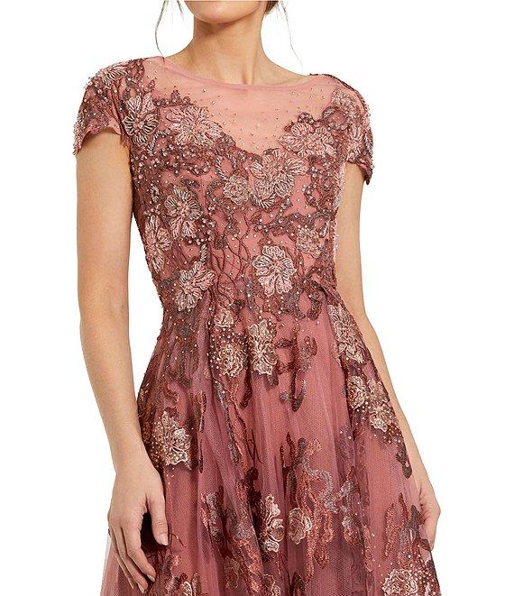Mac Duggal Embroidered Boat Neck Short Sleeve Beaded Floral Applique Gown