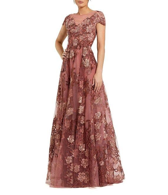From Mac Duggal, this dress features: Embroidered fabrication Ball gown silhouette Boat neck Short sleeves Floral appliques Beaded Zip back closure Approx. 60" length Polyester Hand wash cold Imported.