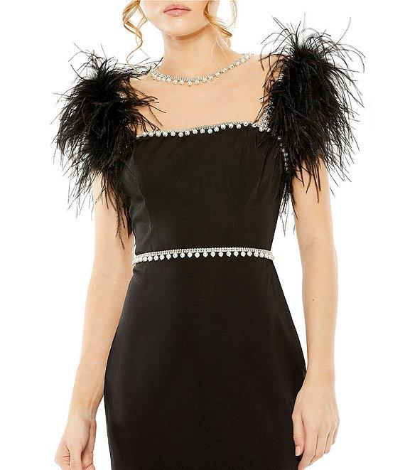 From Mac Duggal, this dress features: Satin fabrication Pencil silhouette Illusion square neckline Feather cap sleeves Pearl embellished Lined Center back zipper closure Approx. 45" in length Polyester Spot clean Imported.