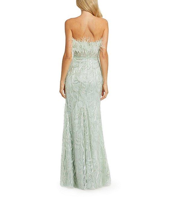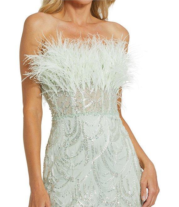 From Mac Duggal, this gown features: Sheath silhouette Embroidered mesh fabrication with beading Strapless with feather trim Corset bodice Zip back closure Lined Approx. 62" length Polyester Spot clean Imported.