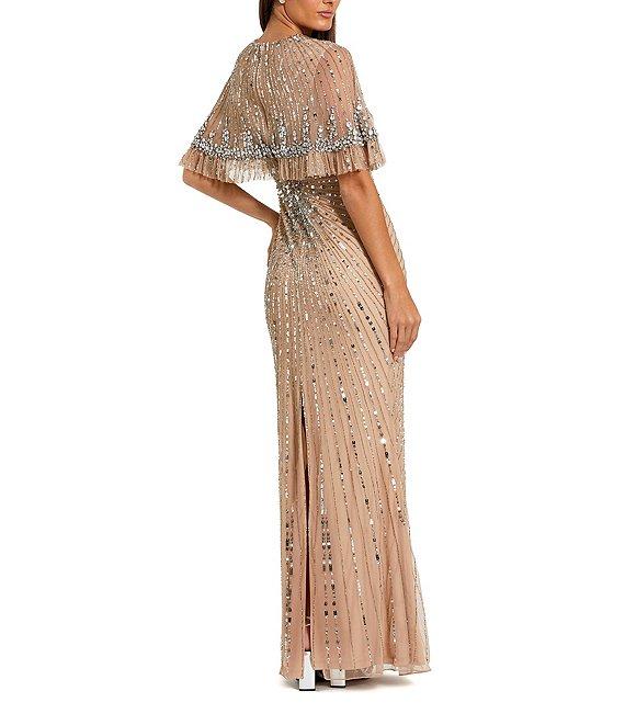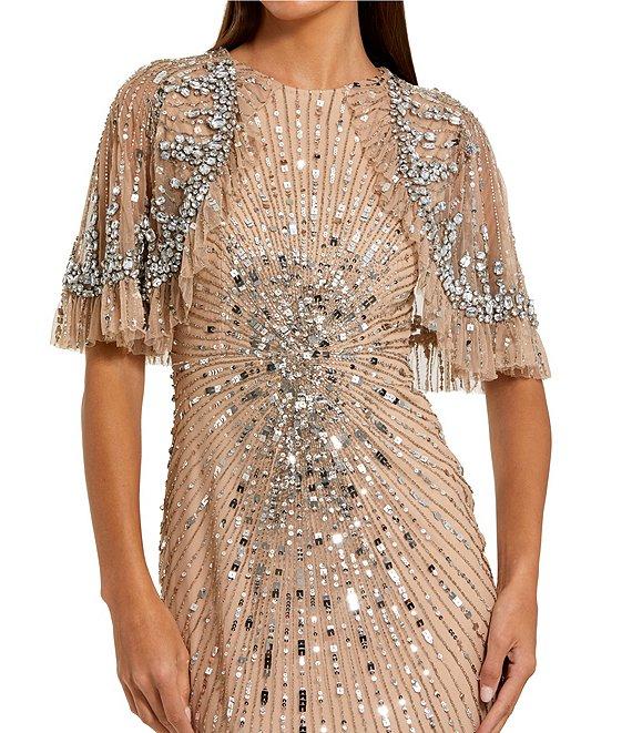 Mac Duggal Fitted Beaded Mesh Caplet Gown