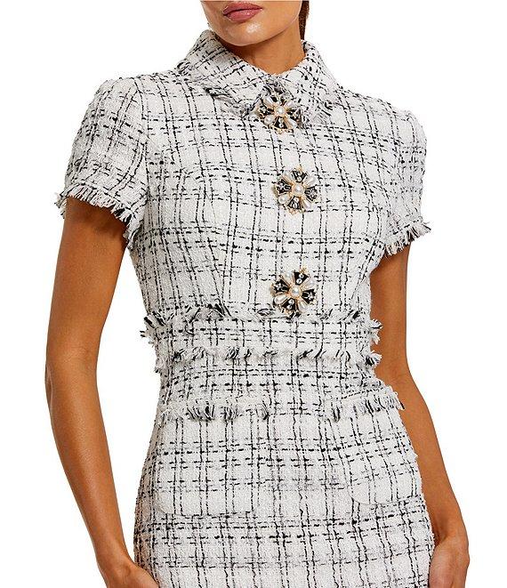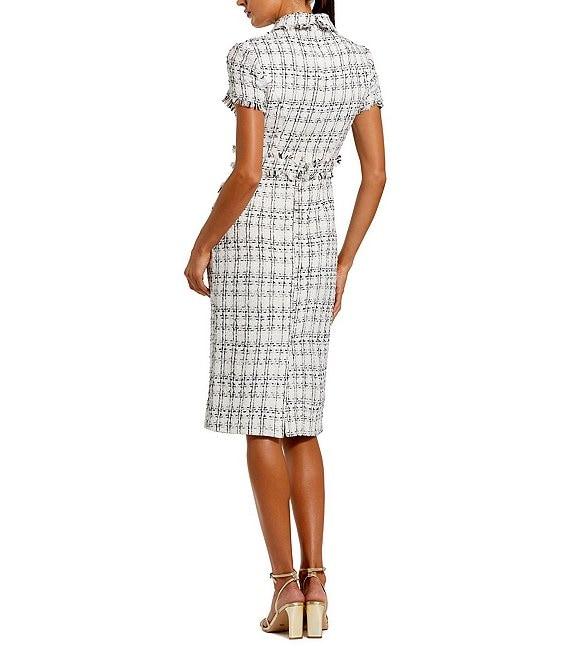 From Mac Duggal, this dress features: Boucle fabrication Sheath silhouette Short sleeves Collar neckline Embellished buttons Frayed trim Zip back closure Approx. 45" length Hand wash cold Imported.