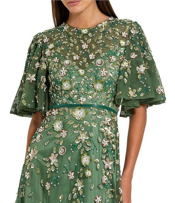From Mac Duggal, this dress features: Mesh fabrication A line silhouette Crew neckline Flutter short sleeves Floral beaded embroidery Zipp back closure Approx. 45" length Polyester Hand wash cold Imported.