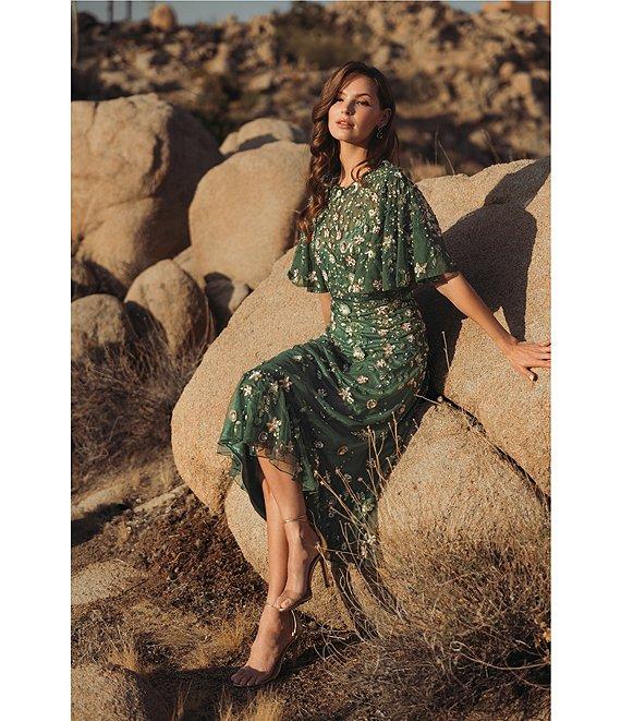 Mac Duggal Floral Beaded Mesh Flutter Sleeve Midi Dress