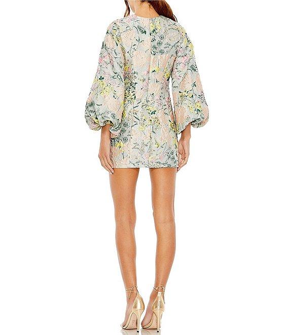 Mac Duggal Floral Brocade Crew Neckline Long Puff Sleeve Mini Dress