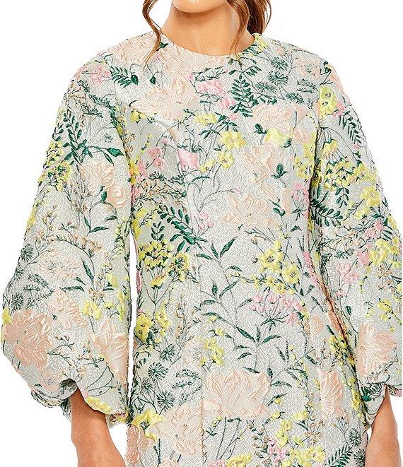 From Mac Duggal, this dress features:all over floral brocade fabrication Sheath silhouette crew neckline long puff sleeve fully lined center zip back closure 35" length from HPS polyester Spot cleanImported.