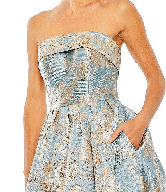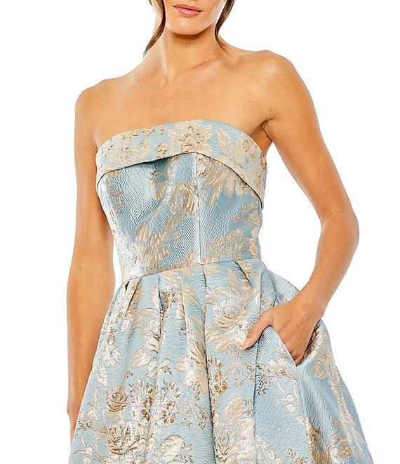 From Mac Duggal, this dress features: Floral brocade fabrication a-line silhouette Strapless neckline Sleeveless Side pockets Gathered skirt Zip back closure Approx. 46.5" length Polyester Spot clean Imported.