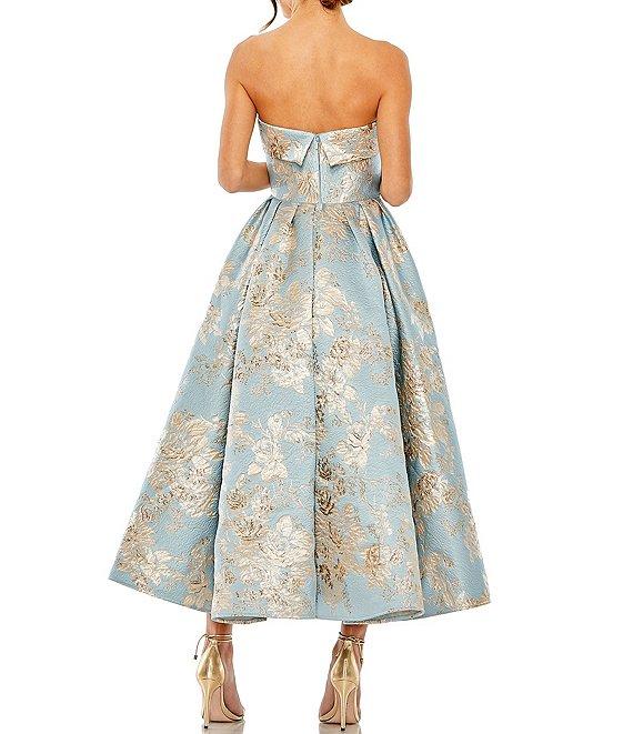 Mac Duggal Floral Brocade Strapless Sleeveless Gathered Skirt Side Pocket Midi A-Line Dress