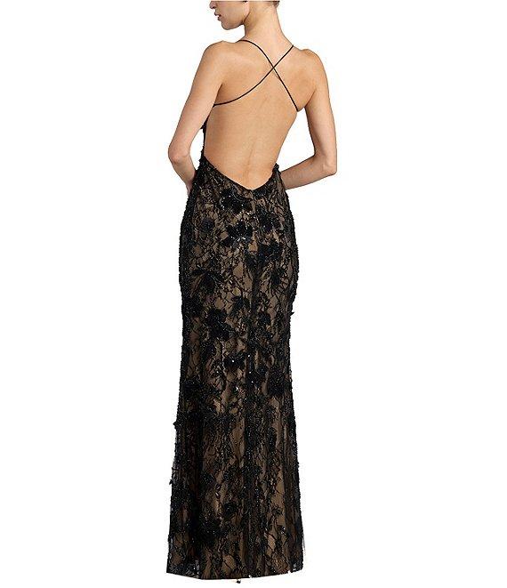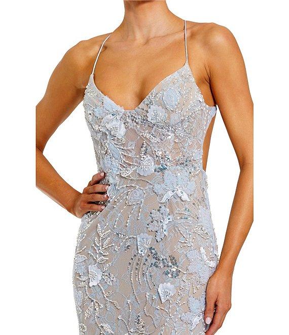 From Mac Duggal, this dress features: Lace embroidered fabrication Sheath silhouette V neckline Sleeveless Criss cross open back Zip back closure Approx. 61" length Polyester Dry clean Imported.