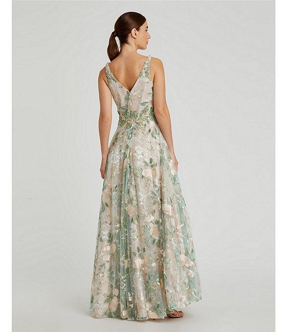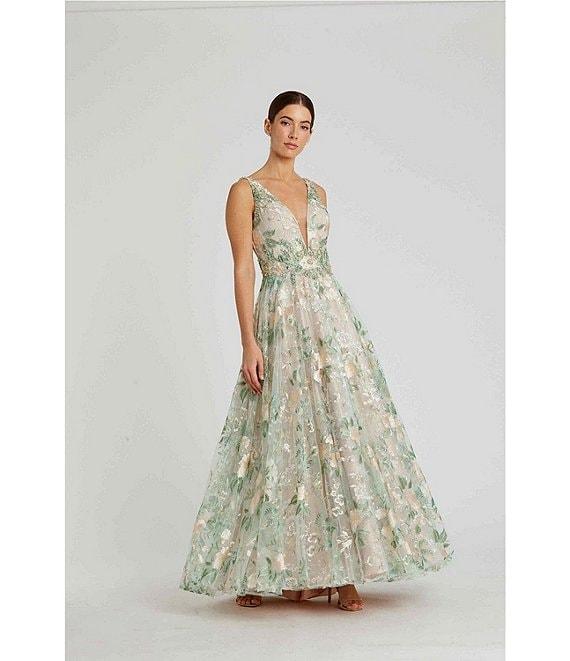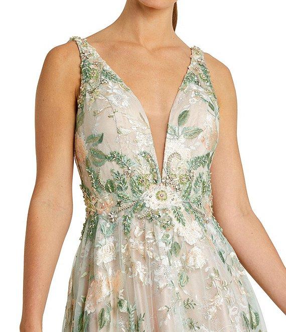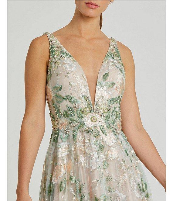 From Mac Duggal, this dress features: Tulle fabrication A line silhouette V neckline Sleeveless Embroidered floral design Fully lined Zip back closure Approx. 60" length Polyester Dry clean Imported.