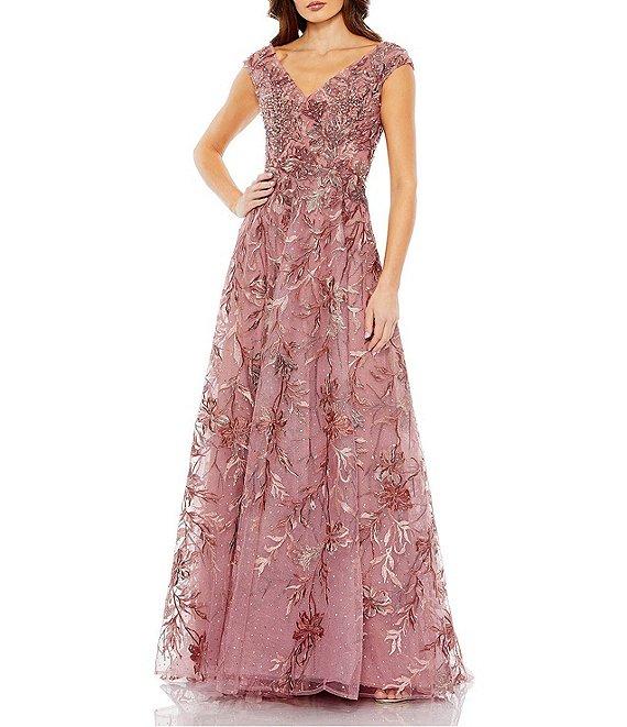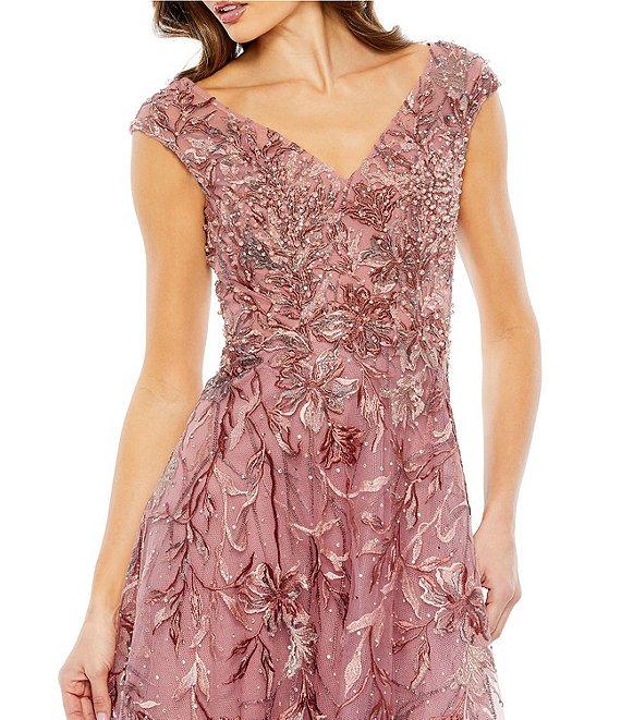 From Mac Duggal, this gown features: floral embroidered fabrication A-line silhouette V-neckline cap sleeves open back lined center back zip closure approx. 63.5" from shoulder to hem polyester spot clean/dry flat Imported.