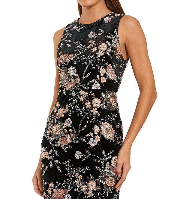 From Mac Duggal, this dress features: Velvet fabrication Sheath silhouette Crew neckline Sleeveless Floral embroidery Zip back closure Approx. 45" length Polyester Hand wash cold Imported.