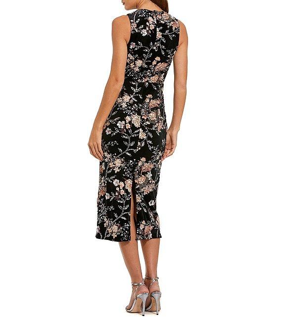 Mac Duggal Floral Embroidered Velvet Crew Neck Sleeveless Midi Dress