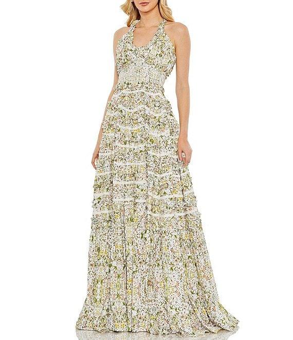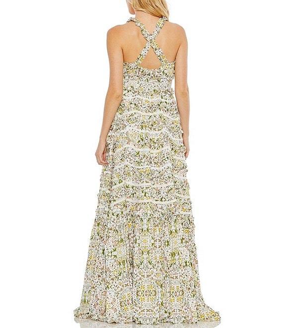 From Mac Duggal, this dress features: Micro-ruffle mesh overlay fabrication Ball gown silhouette Halter neckline Sleeveless Smocked bodice Cross back Floral print Fully lined Flutter hemline Pullover construction Approx. 62.5" length Polyester Hand wash Imported.