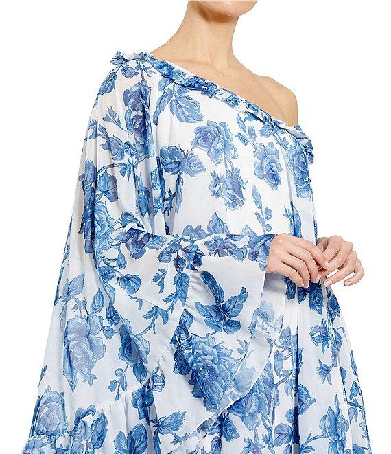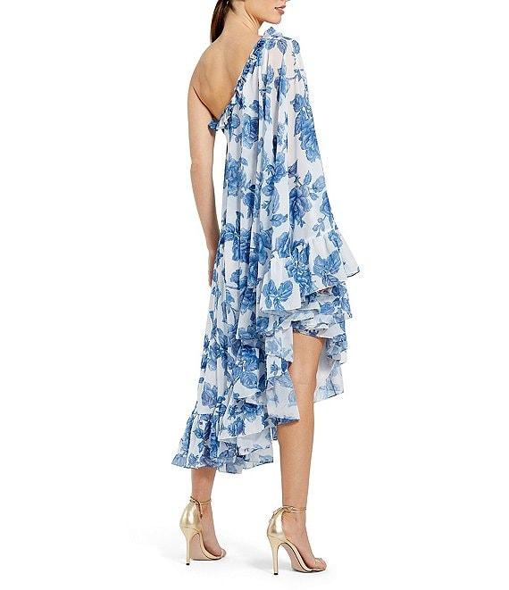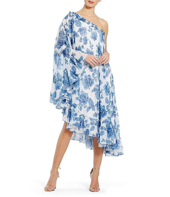 From Mac Duggal, this dress features:Floral printed chiffonFully linedOne-shoulder bell sleeveConcealed back zipperRuffled hemMidi lengthApprox. 48" in lengthDry CleanImported.