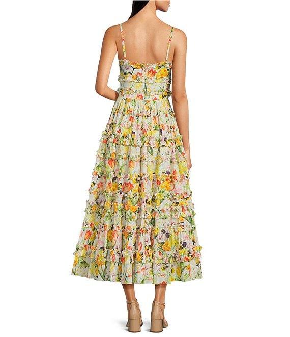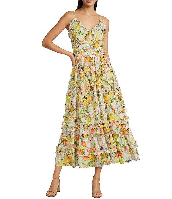 Mac Duggal Floral Print V-Neck Spaghetti Strap Ruffle Embellished A-Line Maxi Dress