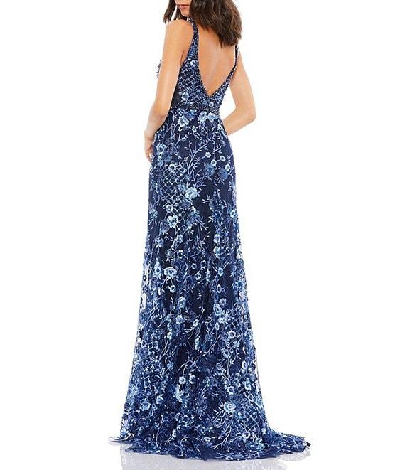From Mac Duggal, this gown features: sheath silhouette v-neckline sleeveless low scoop back detail floral embellished intended to hit the floor lined center back zip closure approx. 63" from shoulder to hem polyester spot clean/lay flat to dry Imported.