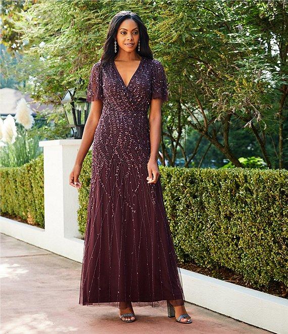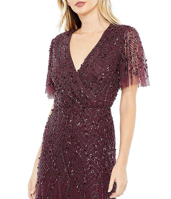 From Mac Duggal, this gown features: beaded fabricationsheath silhouettesurplice v-necklineflutter short sleeveslinedcenter back zip closureapprox. 65" from shoulder to hempolyesterspot clean/dry flatImported.