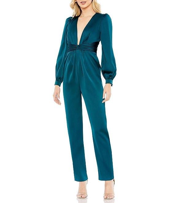 Mac Duggal Front Twist Long Puff Sleeve Deep V-Neck Jumpsuit