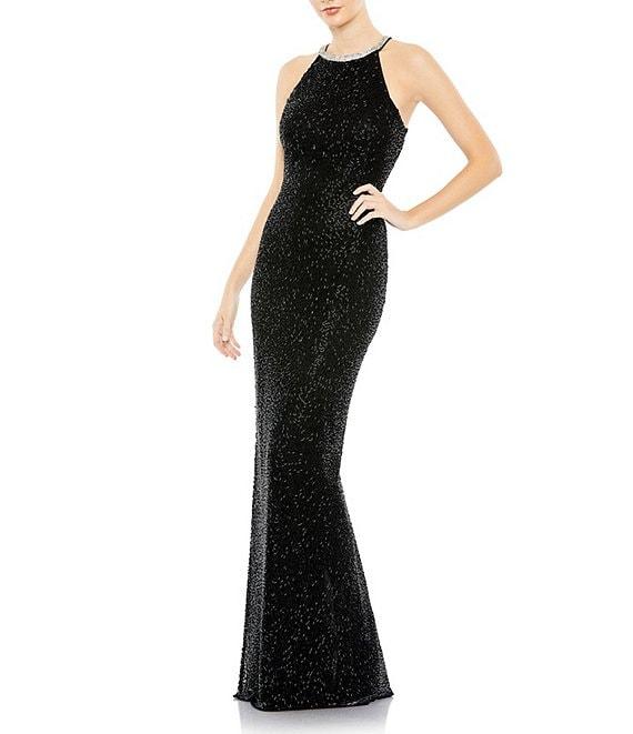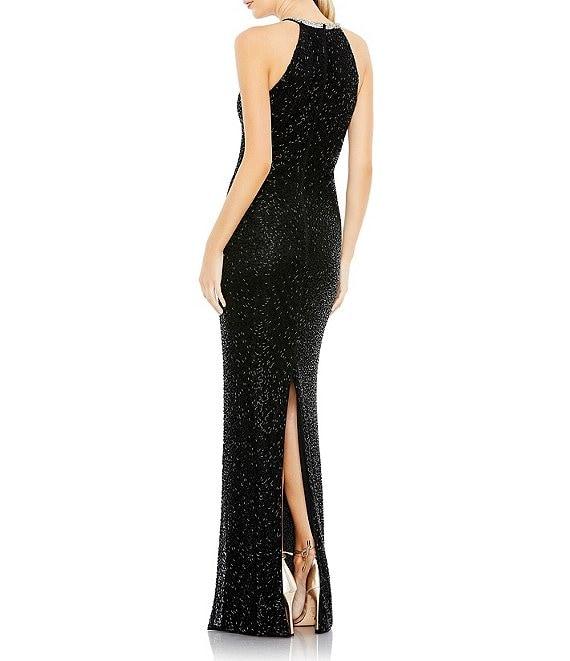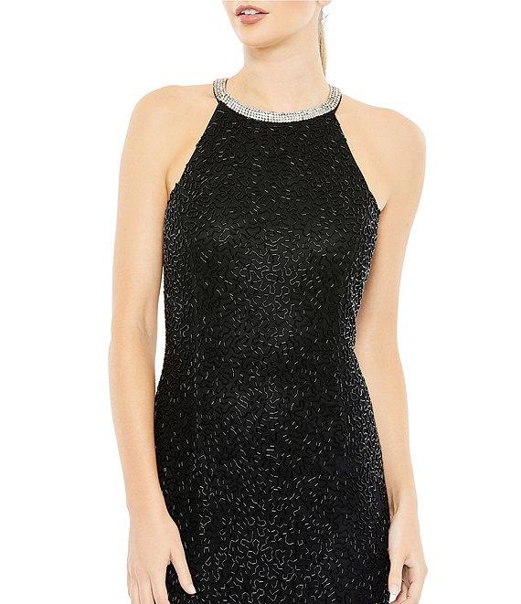 Mac Duggal Halter Neck Sleeveless Beaded Mesh Column Gown