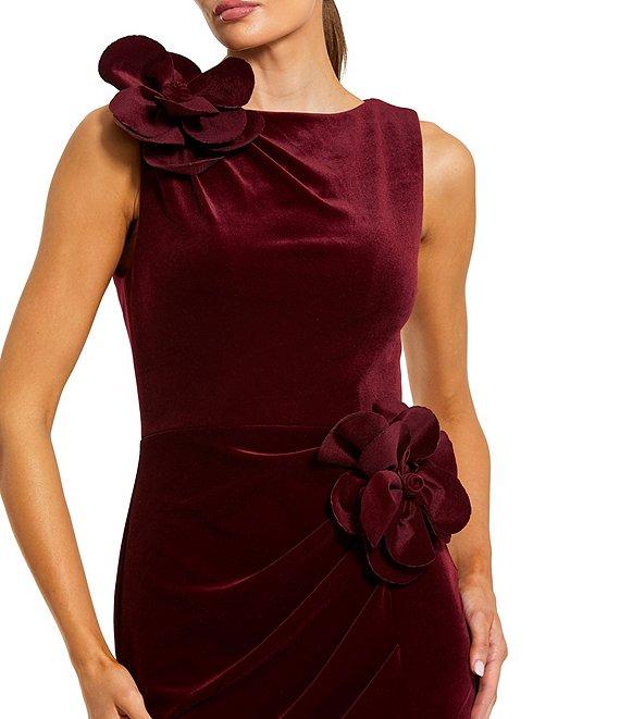 From Mac Duggal, this dress features: Velvet fabrication Column gown silhouette Crew neckline Sleeveless 3D Floral applique Zip back closure Approx. 60" length Polyester Hand wash Imported.
