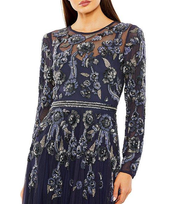 From Mac Duggal, this dress features: Aline silhouette Mesh fabrication Floral beaded motif Round neckline Illusion yoke Sheer long sleeves Contrast waist beading Zip back closure Lined Approximate length 60" Polyester Hand wash Imported.