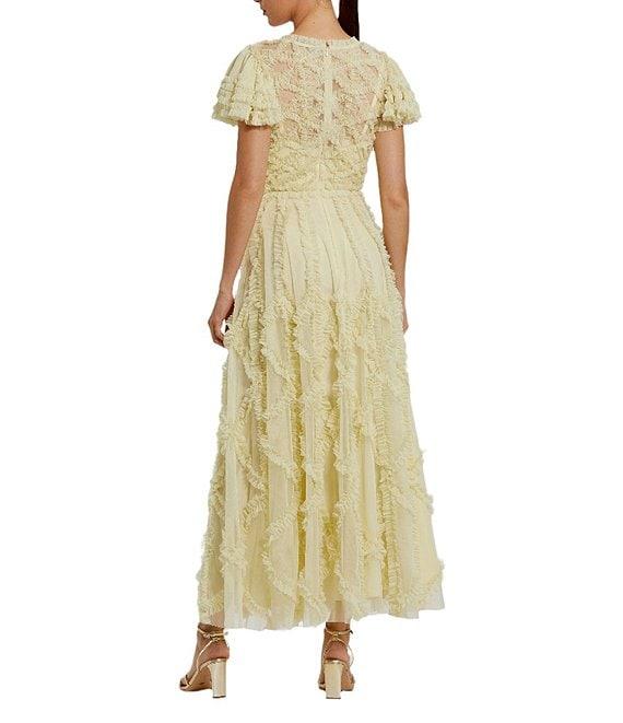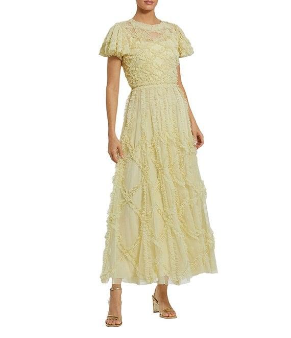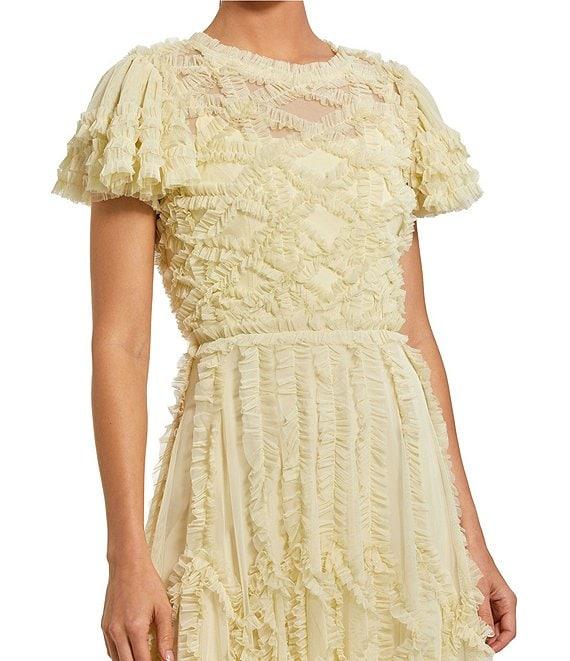 From Mac Duggal, this dress features: A-line silhouette Mesh fabrication Micro ruffle details Illusion crew neckline Short flutter sleeves Illusion back yoke Waist seam Zip back closure Lined Approx. 53" length Polyester Hand wash cold Imported.