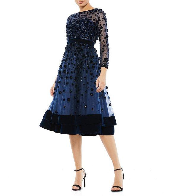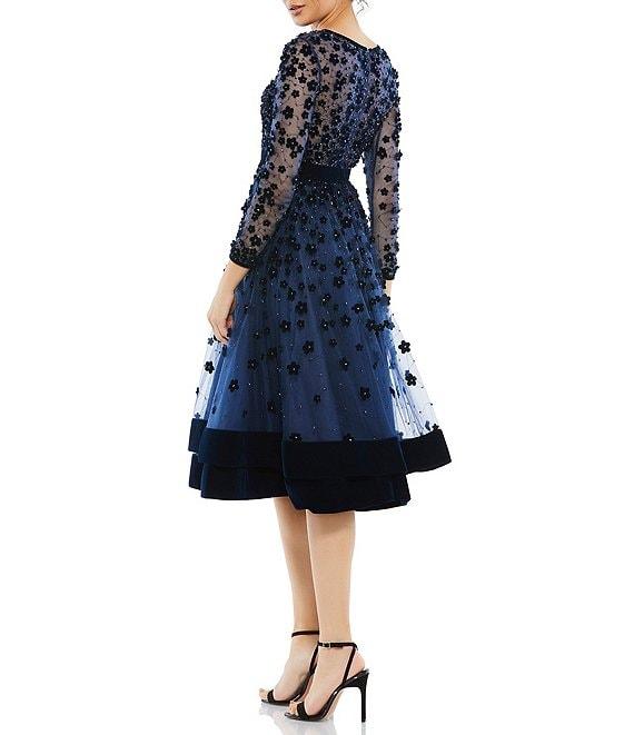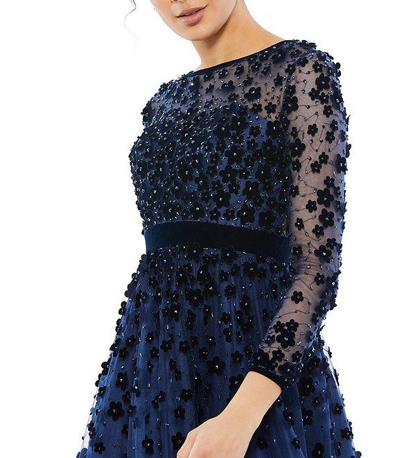 From Mac Duggal, this dress features: fit and flare silhouette round neckline long sleeves velvet trim floral embellishments fully lined center back zipper closure approx. 48.5" length from shoulder to hem polyester spot clean Imported.