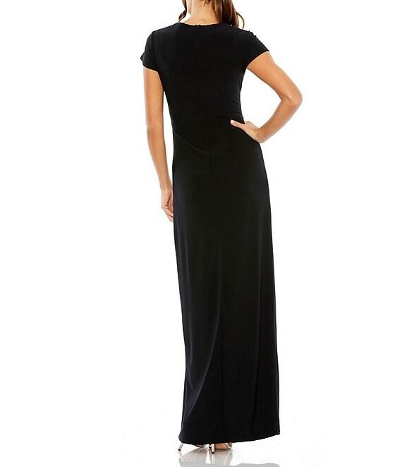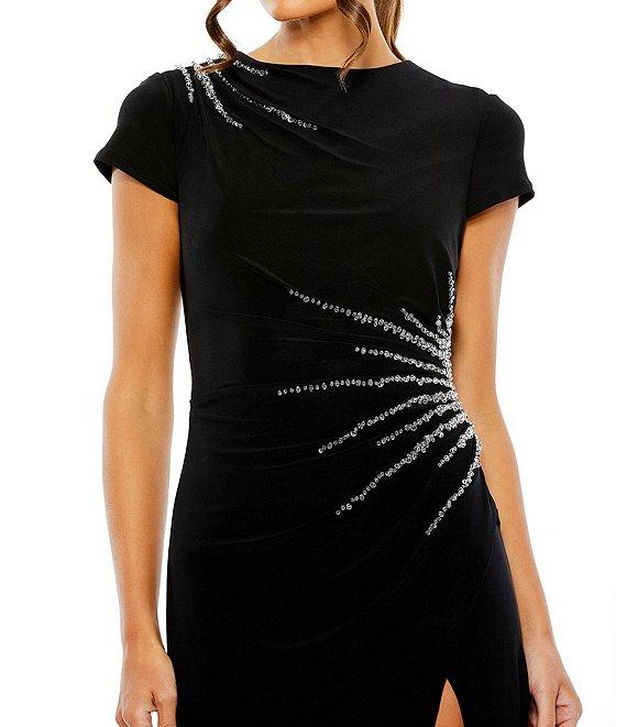 From Mac Duggal, this dress features: Jersey fabrication Sheath silhouette Crew neckline Short sleeves Side beaded detail High slit Zip back closure Approx. 60" length Polyester Hand wash cold Imported.