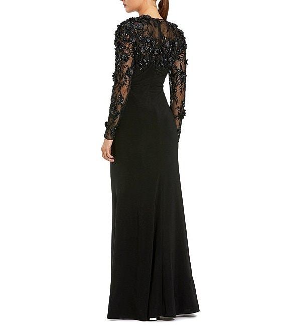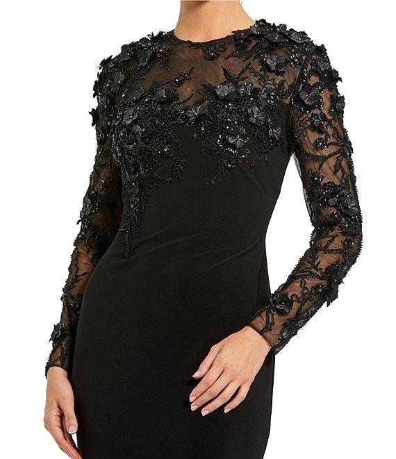 From Mac Duggal, this dress features: Jersey fabrication Fitted gown silhouette Crew illusion neckline Long sleeves Floral embellishment Zip back closure Approx. 60" length Polyester Hand wash Imported.