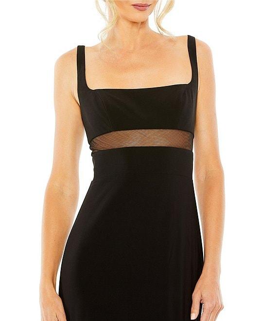 From Mac Duggal, this dress features: Jersey fabrication Sheath silhouette Square neckline Sleeveless Mesh cutouts Zip back closure Approx. 60" length Polyester Hand wash cold Imported.