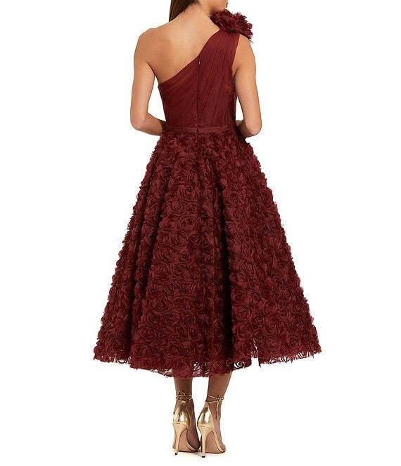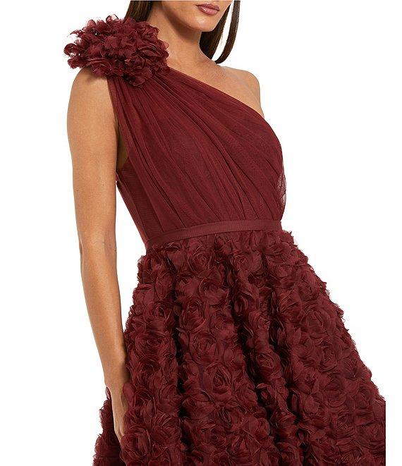 From Mac Duggal, this dress features: Lace fabrication A-line silhouette One shoulder 3D flower appliques Midi Concealed back zipper Approx. 45" length Polyester Dry clean Imported.