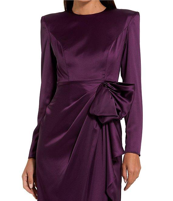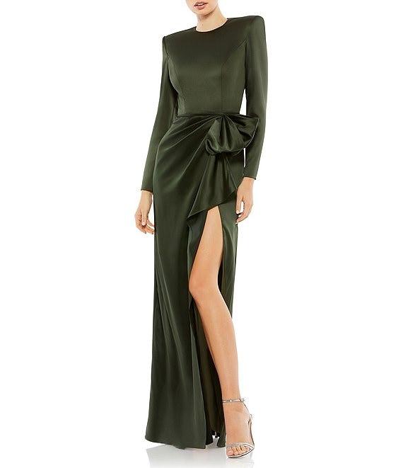 Mac Duggal Long Sleeve Crew Neck Ruched Waist Draped Bow Thigh High Slit Satin A-Line Gown