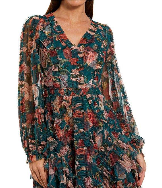 Mac Duggal Long Sleeve Mesh A Line Floral Print Midi Dress With Ruffles