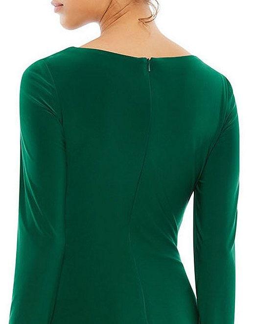 From Mac Duggal, this gown features: sheath silhouette surplice v-neckline long sleeves lined center back zip closure approx. 63" from shoulder to hem polyester spot clean/dry flat Imported.