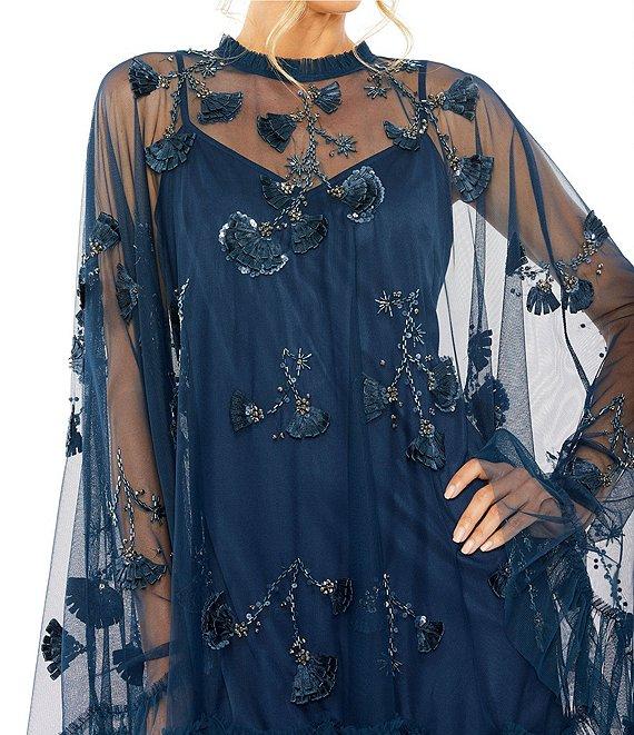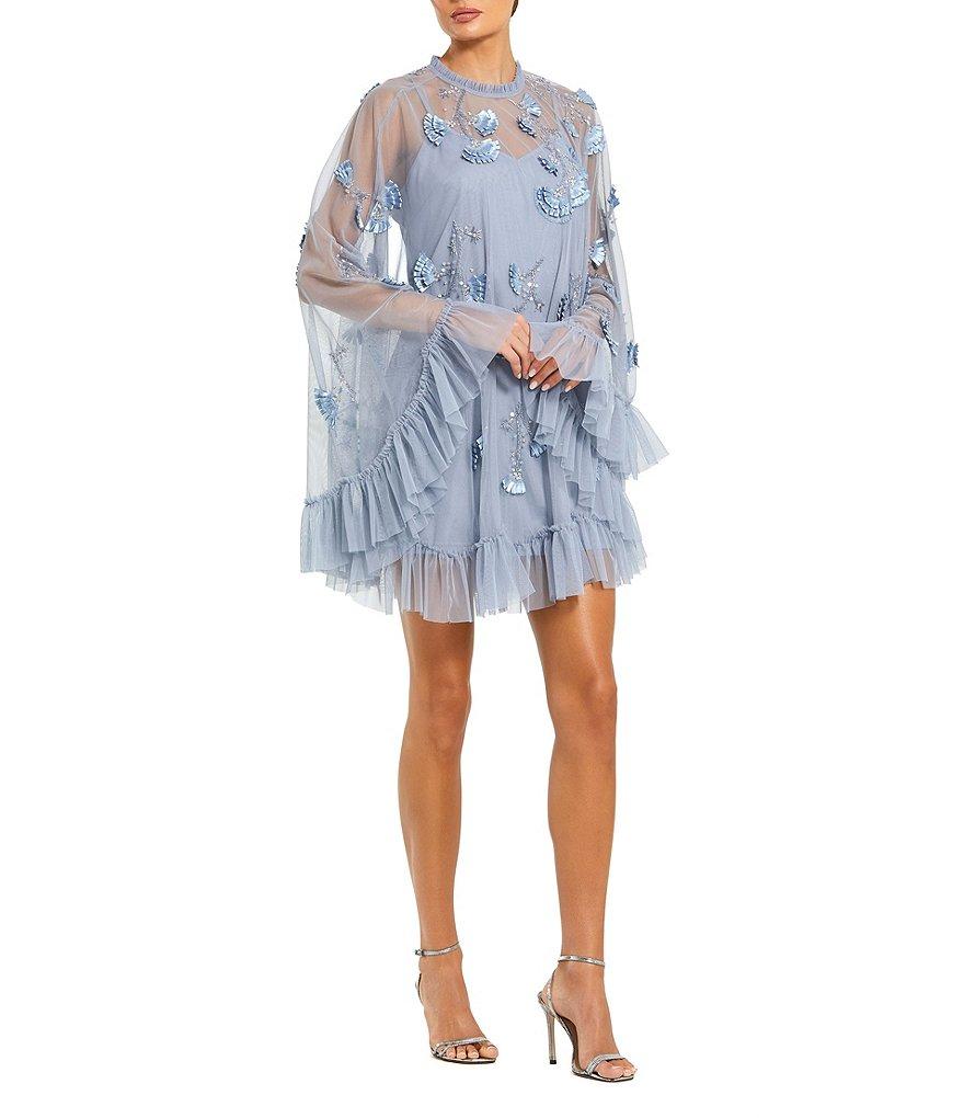 Mac Duggal Mock Neck Long Flared Sleeve Mesh A-Line Mini Dress