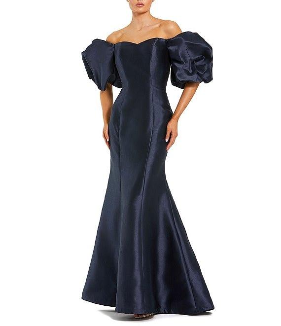 From Mac Duggal, this gown features: Satin fabrication off-the-shoulder short puff sleeves fully lined center zip back closure approx. 62.5" length from shoulder to hem polyester spot clean Imported.
